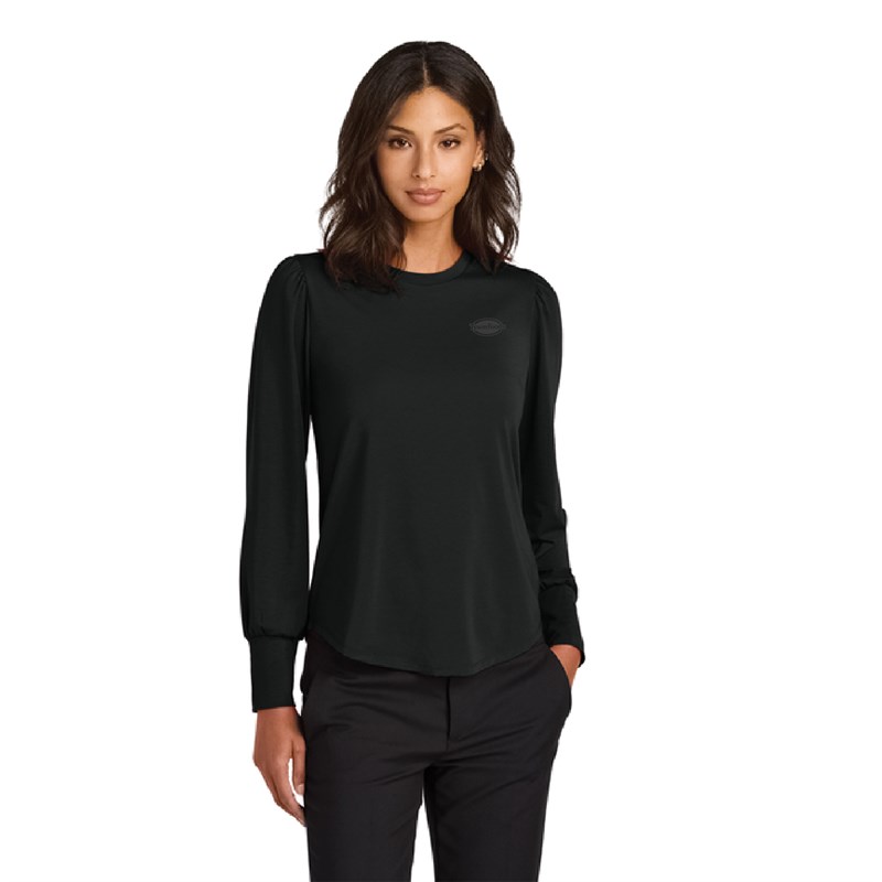 With delicately puffed blouson sleeves and a self-banded jewel neckline, this top offers a soft, feminine silhouette that moves effortlessly from casual to polished. Made from a lightweight 5-ounce polyester/spandex jersey, it's moisture-wicking for all-day comfort and features a flattering rounded drop tail hem. Designed to wear tucked or untucked, it's an easy go-to for elevated everyday style.