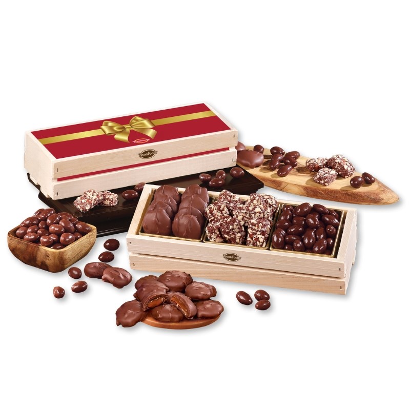 A handcrafted, sustainable wooden crate—Made in the USA and firebranded with your logo—filled with nearly a pound of our finest chocolates: buttery toffee, rich caramel pecan clusters, and indulgent chocolate-covered almonds. A personalized, premium gift for any chocolate lover.